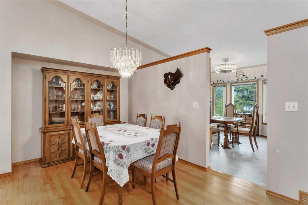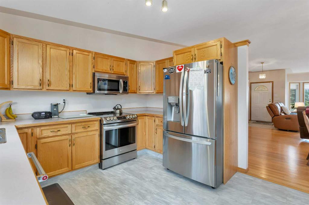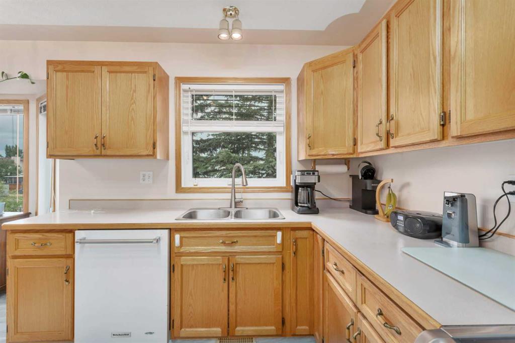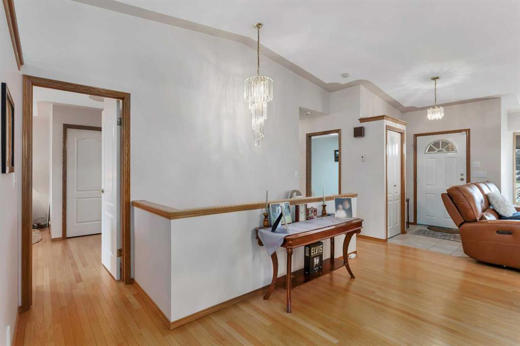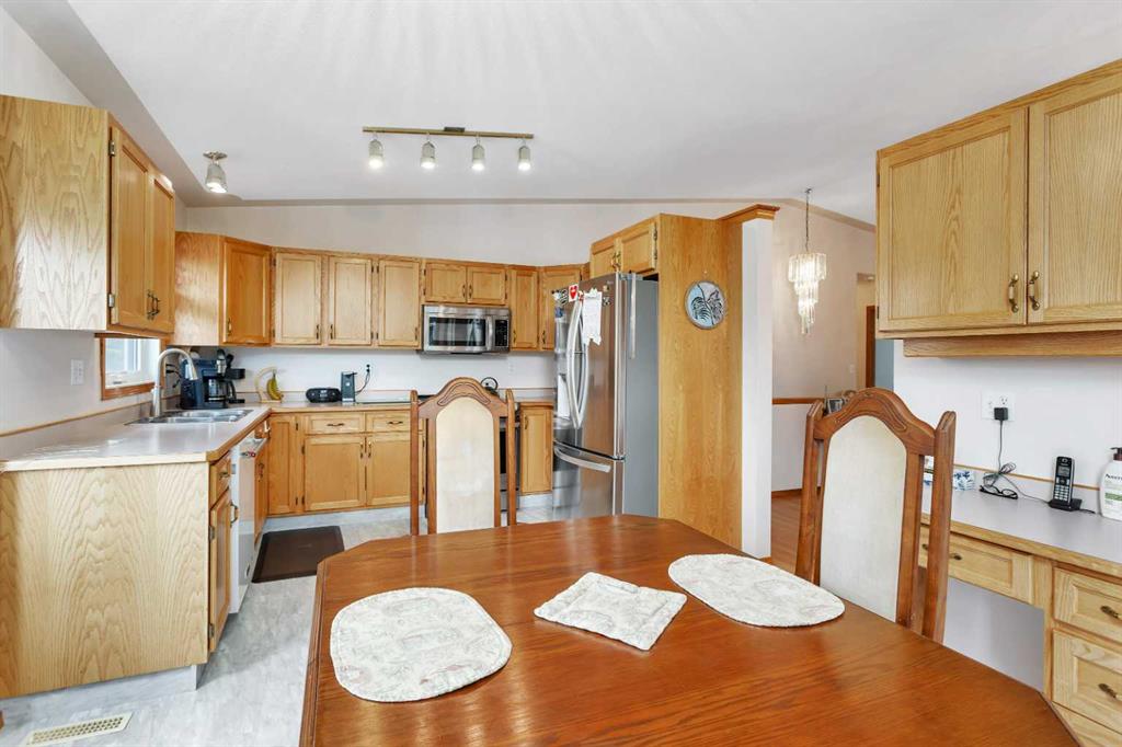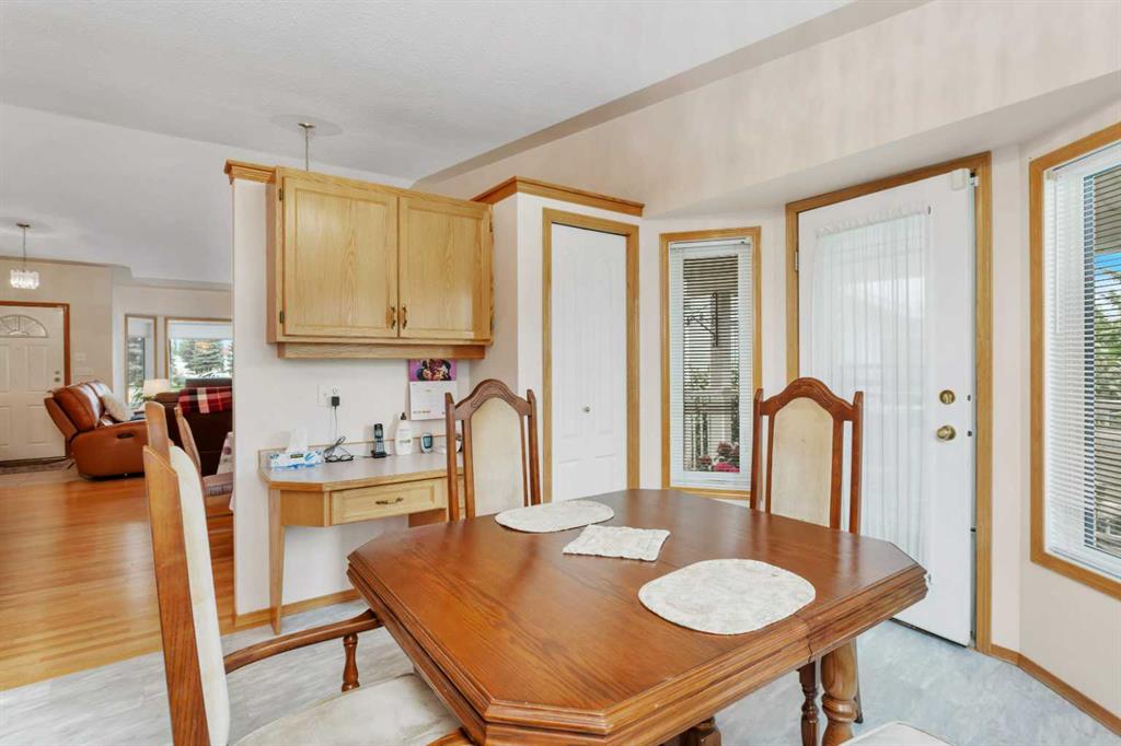 This well-maintained walk-out bungalow is located on a pie-shaped lot, offering a perfect combination of comfort and functionality. In 2024, all windows on both the main level and basement were replaced with triple glazed vinyl windows, resulting in improved energy efficiency for the home. The main floor has 1,352 square feet and features a vaulted ceiling in the kitchen, dining, and living areas, creating an open and inviting atmosphere. The hardwood floors, along with natural wood trim and cabinetry, enhance the home’s warm ambiance. The large primary suite includes a walk-in closet and ensuite with a shower. A 4-piece bathroom with a jetted tub is conveniently located across the hall from a versatile den—ideal for a Murphy bed or sofa bed, making it adaptable to your needs. The generous entry from the garage accommodates a main-floor laundry. A stairlift to the walk-out basement offers accessibility for those with mobility concerns. In the walk-out basement you'll find a spacious bedroom, 3-piece bathroom, kitchenette with a fridge, and bright family room with large windows and cozy corner gas fireplace. Additional features include a sizable recreation room and large storage/furnace room. The custom-covered deck with stairs provides seamless outdoor living space and easy access to the yard. The home's strategic position on the lot allows abundant natural light from east, south, and west-facing windows. This exceptional property is ideal for those seeking a retirement or special needs home without compromising on space and comfort.